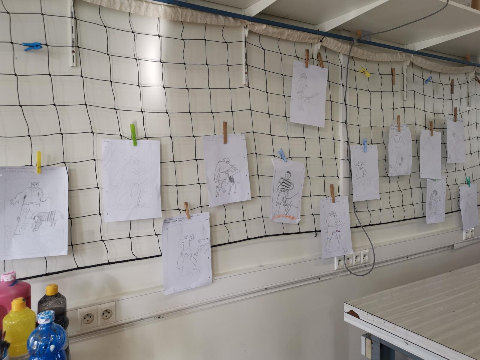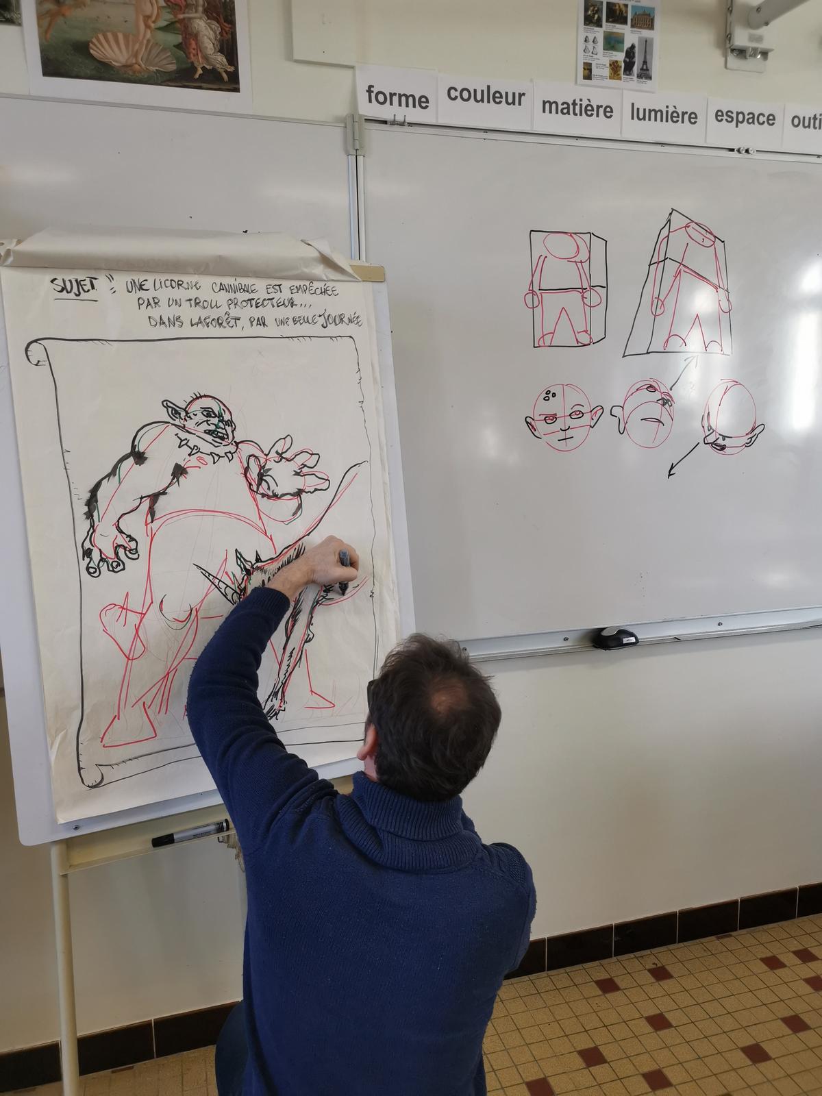 Si les héros américains l’inspirent, il ancre ses histoires dans des lieux qui nous sont plus connus comme la ville de Rennes ou le lac de Guerlédan. Ses œuvres se font également écho des préoccupations de notre époque avec une réflexion sur l’écologie, les migrants, l’amitié, avec le souci de rendre son héros fétiche, Fox Boy, plus humain. Les élèves se sont aussi initiés au dessin après avoir choisi ensemble leur personnage : « un troll aidant une licorne menacée par une autre licorne cannibale ».