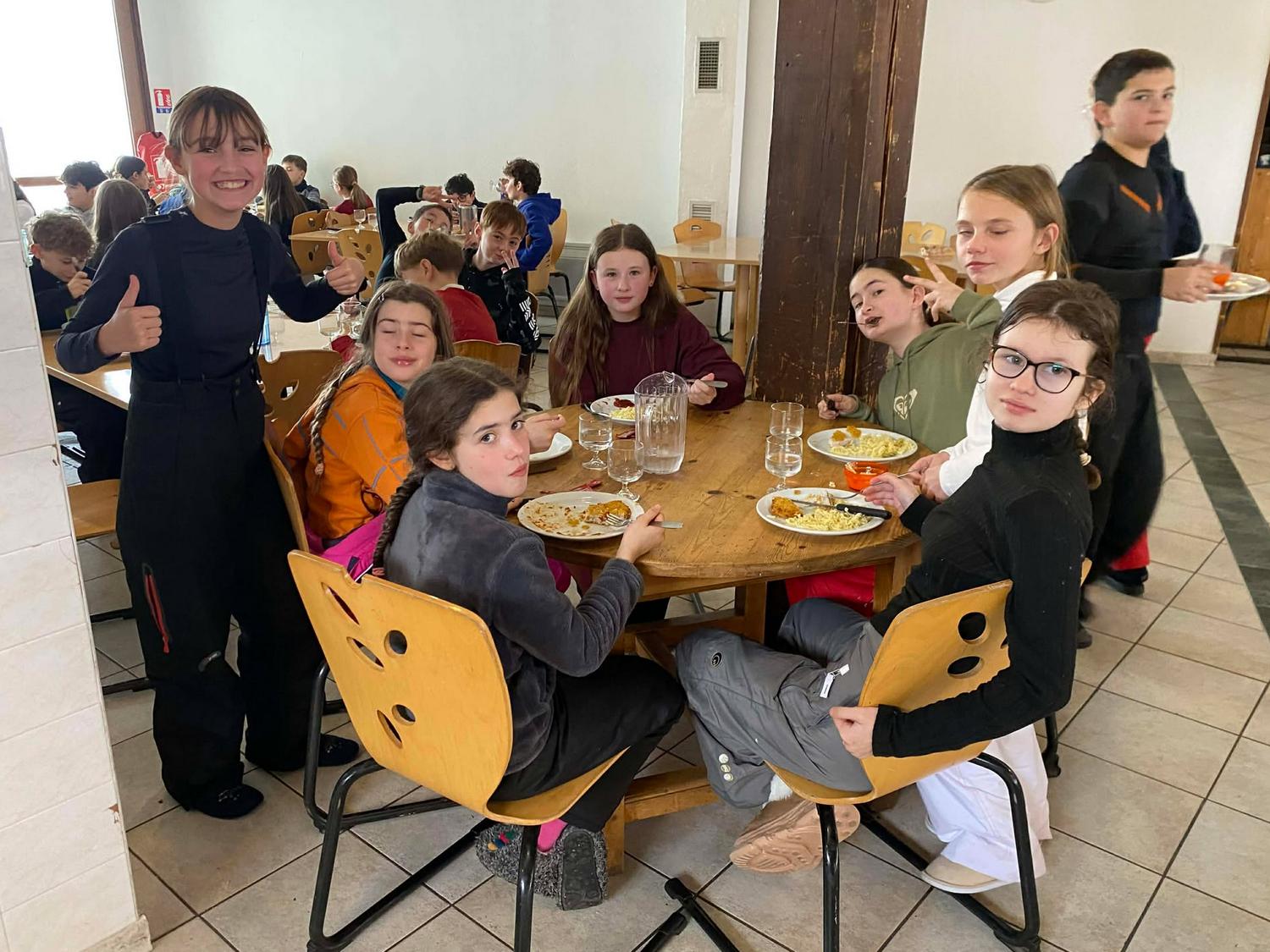 Une nuit calme et reposante, du soleil dès le matin, des cours de ski où les enfants progressent... et des frites à midi ! Des sourires, des joues roses et ce soir : topo neige. Des explications éducatives sur les montagnes et leurs dangers. Même s’il ne neige pas autant qu’en Bretagne les canons à neige offrent des pistes blanches et toutes lisses.